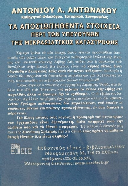 «…ιδιαιτέρως σήμερα, που ζούμε ακριβώς σε μία εποχή ελεγχόμενης επιλεκτικής Μνήμης και κατευθυνόμενης Λήθης και τα ελληνόπουλα μαθαίνουν «όσα τους επιτρέπουν να μάθουν» και ξεχνούν «όσα τους κατευθύνουν να ξεχάσουν». Σ’ αυτό ακριβώς το σημείο η προσφορά του συγκεκριμένου εγχειριδίου είναι αξεπέραστη…»