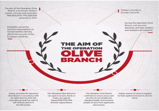 - Η Τουρκία επικαλούνταν ότι διεξήγαγε τις εν λόγω Επιχειρήσεις για να εκδιώξει τους Τζιχαντιστές και τις τρομοκρατικές οργανώσεις ΡΚΚ, KCK, PYD, YPG, από την περιοχή του Αφρίν συμβάλλοντας παράλληλα, και στην πάταξη της παγκόσμιας τρομοκρατίας. Για την εξυπηρέτηση του αφηγήματός της μάλιστα, είχε πλαισιώσει τους πάντες ως τρομοκράτες (π.χ. οι Κούρδοι του PKK, ενώ τα προηγούμενα χρόνια είχαν ενεργό συμμετοχή στην Παγκόσμια Εκστρατεία κατά του ISIS, από την Τουρκία, αποκαλούνταν τρομοκράτες και μέλη του ISIS). Τα τελευταία γεγονότα έδειξαν, ότι η Τουρκία όχι μόνο δεν εκδίωκε τους τρομοκράτες και τους Τζιχαντιστές, αλλά συνεργάζονταν μαζί τους και τους χρησιμοποίησε ως αντιπροσώπους της (proxy), για να ανατρέψει τον Άσαντ.