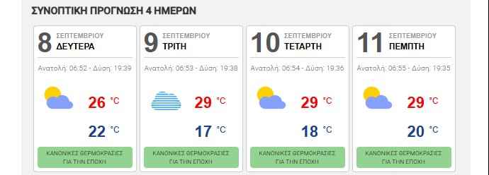 Αύριο Τρίτη, γενικά αίθριος καιρός με πρόσκαιρες νεφώσεις το μεσημέρι – απόγευμα στα ηπειρωτικά, κυρίως ορεινά, όπου πιθανόν να σημειωθούν λίγες τοπικές βροχές ή μπόρες. Τοπικά περιορισμένη ορατότητα τις πρωινές ώρες στα δυτικά. Οι άνεμοι θα είναι στα δυτικά μεταβλητοί 3 με 4 μποφόρ και στο Ιόνιο θα πνέουν δυτικοί βορειοδυτικοί με την ίδια ένταση. Στα ανατολικά θα είναι μεταβλητοί 3 με 4 και στο Αιγαίο θα πνέουν από βόρειες διευθύνσεις 4 με 5 και στο ανατολικό Αιγαίο τοπικά 6 μποφόρ. Η θερμοκρασία δεν θα σημειώσει αξιόλογη μεταβολή. Στα ηπειρωτικά θα φτάσει τους 31 με 33 και τοπικά στα ανατολικά 34 βαθμούς, στα νησιά του Ιονίου, του ανατολικού Αιγαίου και την Κρήτη τους 29 με 31 βαθμούς και στις Κυκλάδες τους 26 με 28 βαθμούς Κελσίου.
