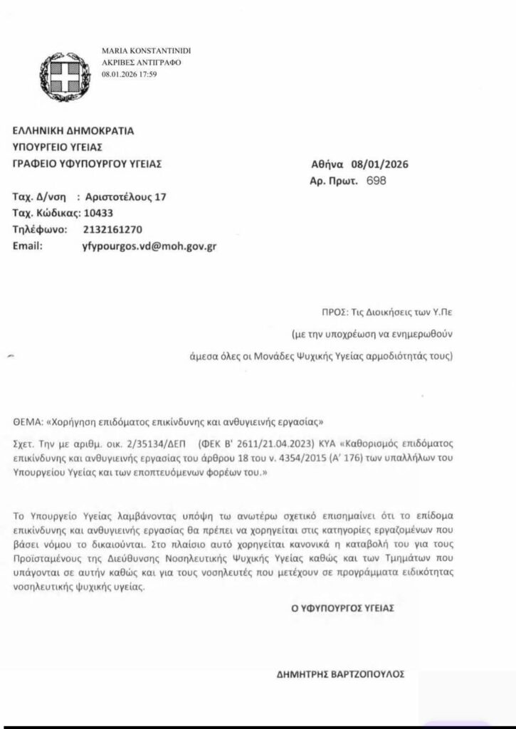 “Ναι” του υφυπουργού Υγείας, Δημήτρη Βαρτζόπουλου, σε ερώτημα σχετικά με την καταβολή επιδόματος Επικίνδυνης και Ανθυγιεινής Εργασίας, στους Προϊσταμένους της Διεύθυνσης Νοσηλευτικής Ψυχικής Υγείας, καθώς και των Τμημάτων που υπάγονται σ’ αυτή και στους νοσηλευτές που μετέχουν σε Προγράμματα ειδικότητας Νοσηλευτικής Ψυχικής Υγείας.