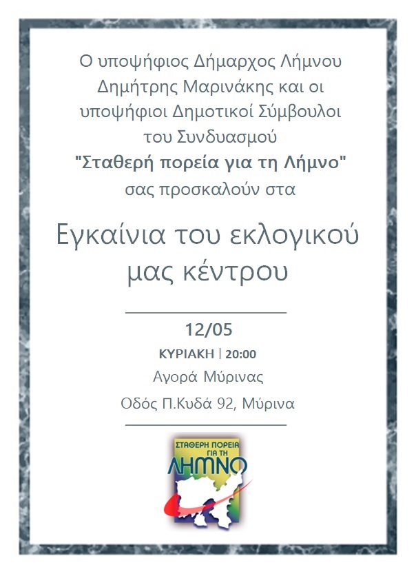 Ο συνδυασμός του υποψήφιου δημάρχου Δημήτρη Μαρινάκη “Σταθερή πορεία για τη Λήμνο”, σας προσκαλεί στα εγκαίνια του εκλογικού του κέντρου, την ερχόμενη Κυριακή 12/5 στις 20:00.