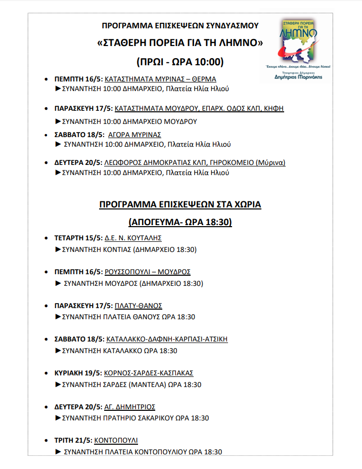 Το Πρόγραμμα των επισκέψεων του συνδυασμού “Σταθερή πορεία για τη Λήμνο”