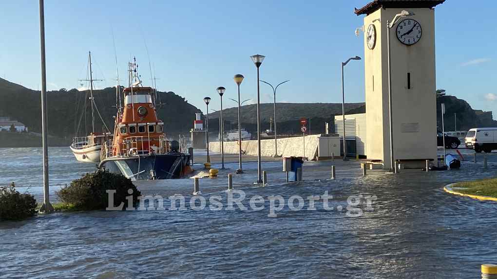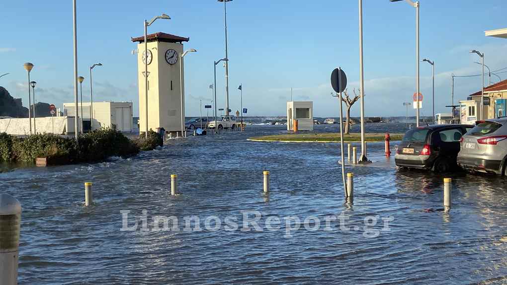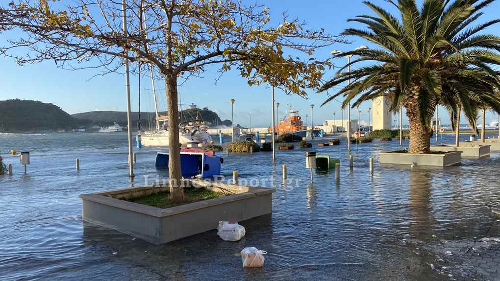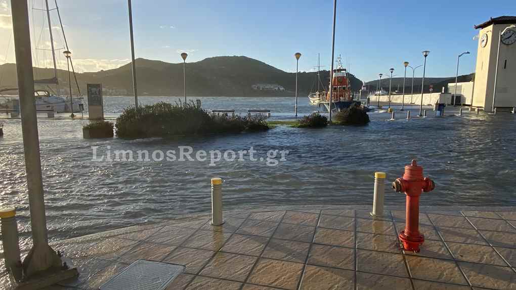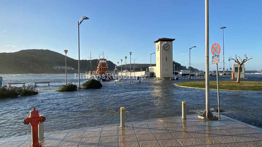 Απίστευτες εικόνες στην Μύρινα,σήμερα το πρωί από τους θυελλώδεις άνεμους η στάθμη του νερού ανέβηκε και κάλυψε το λιμάνι