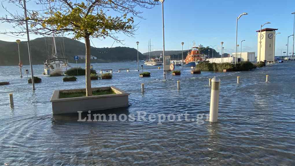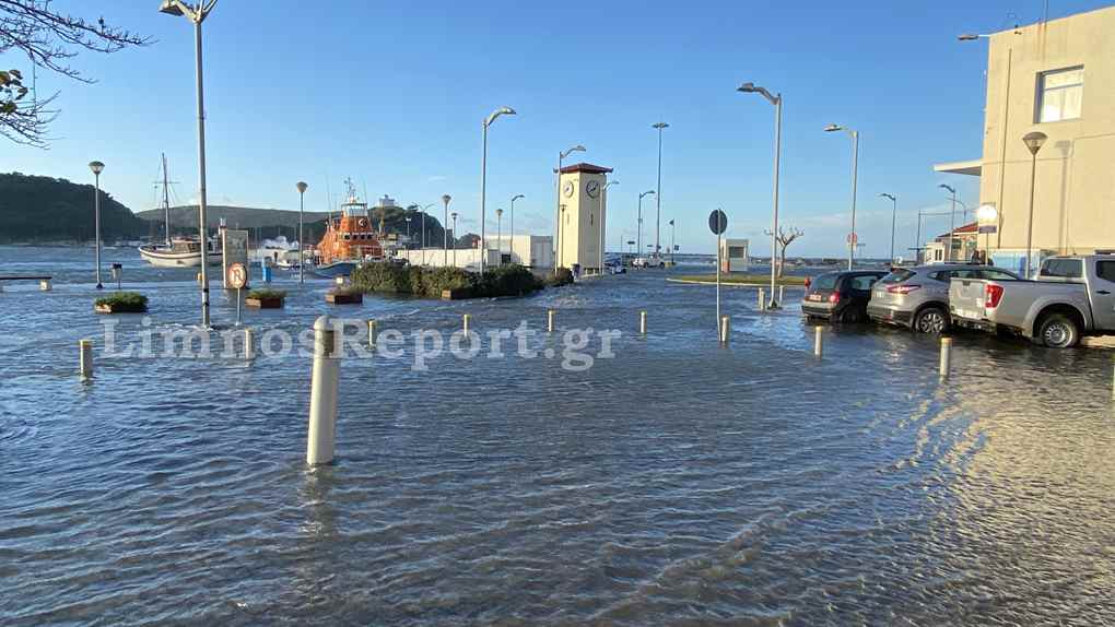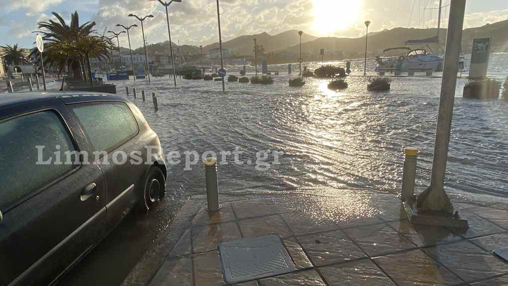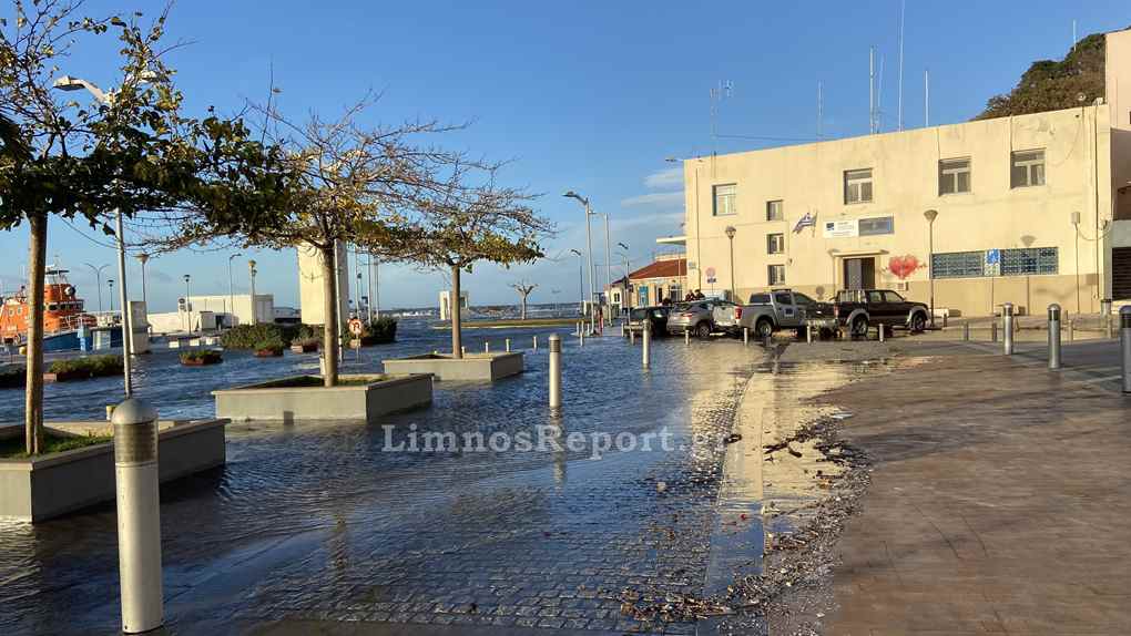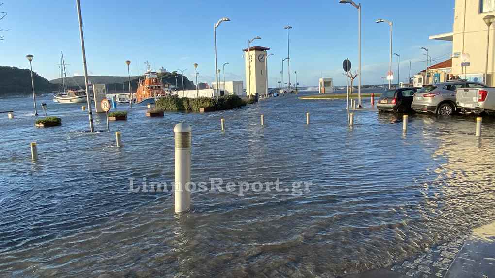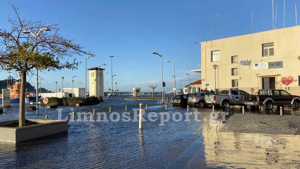 Ο δρόμος στο παλαιό λιμάνι της Μύρινας μπροστά από το Δημαρχείο έχει βυθιστεί στην κυριολεξία κάτω από το νερό
