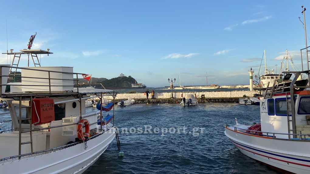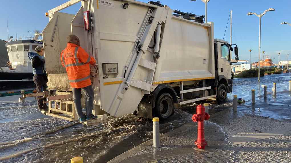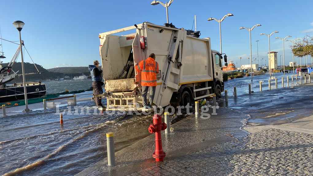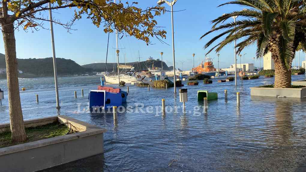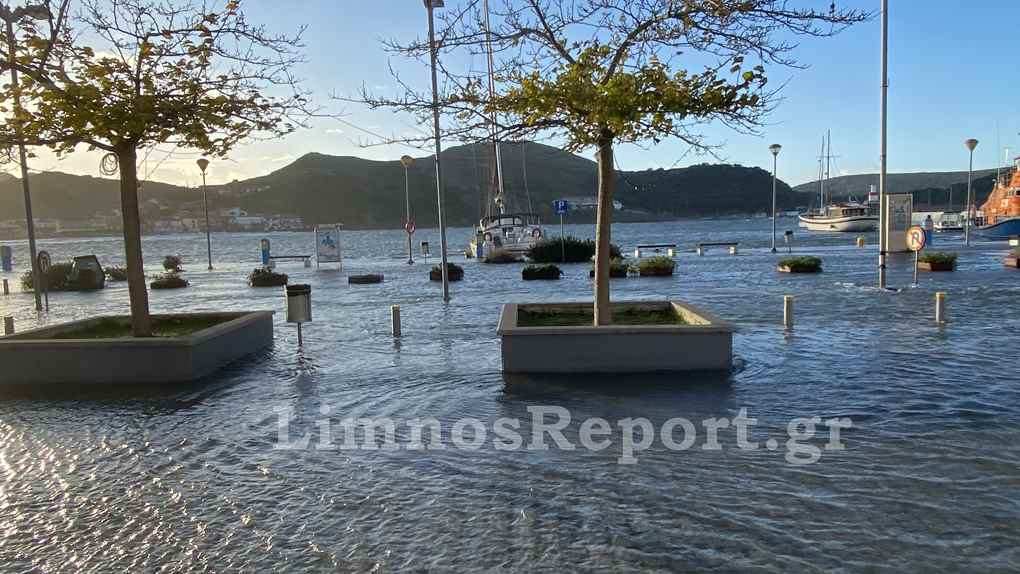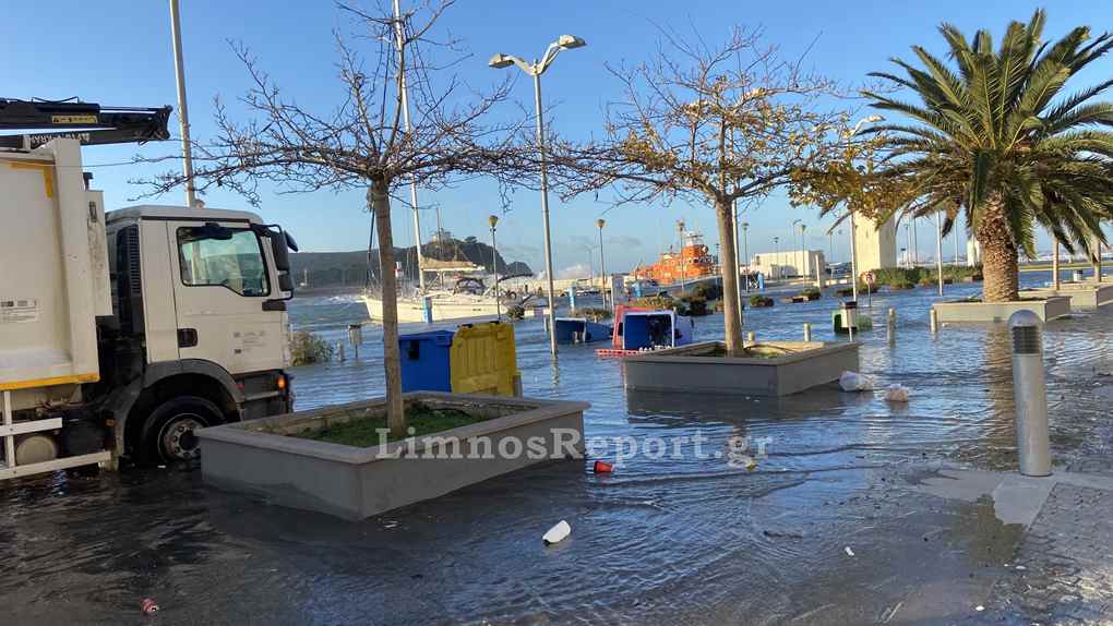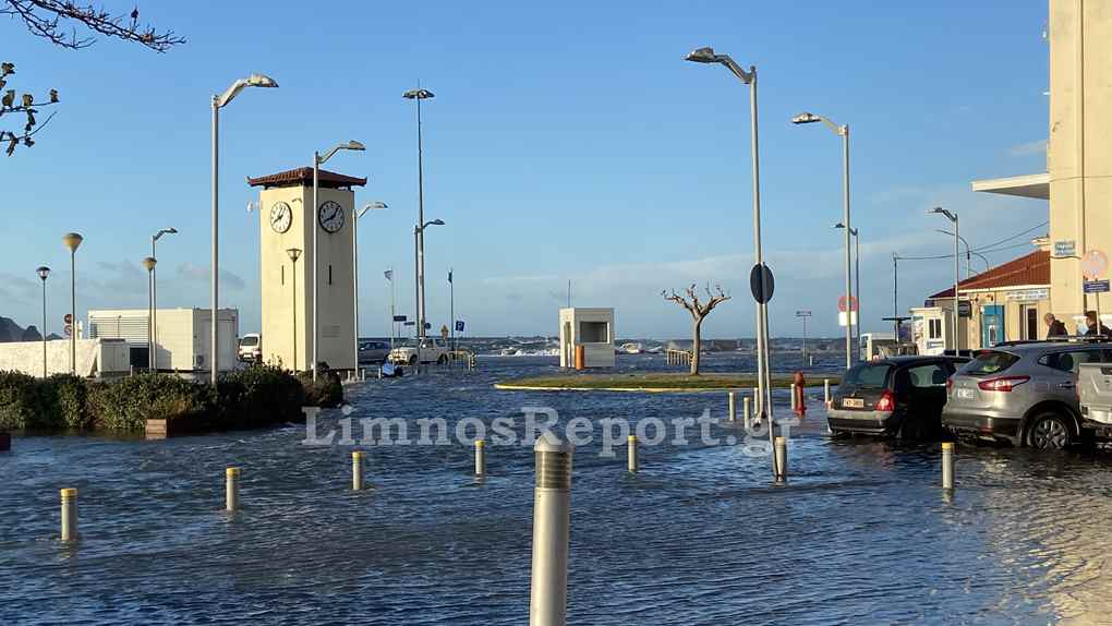 Ο δρόμος στο παλαιό λιμάνι της Μύρινας μπροστά από το Δημαρχείο έχει βυθιστεί στην κυριολεξία κάτω από το νερό