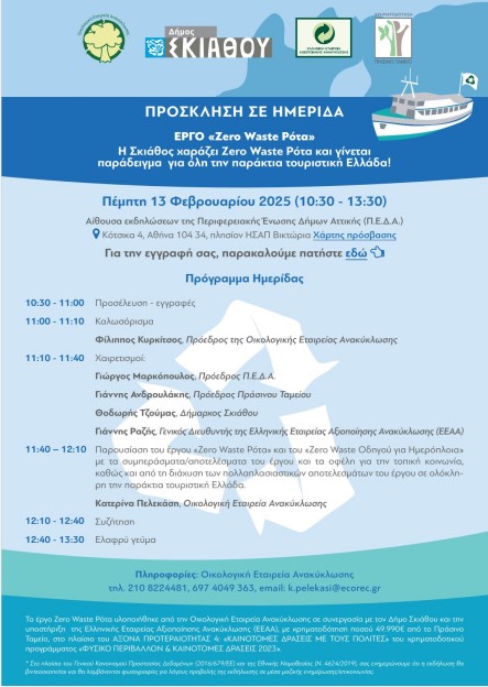 Οι δράσεις και τα αποτελέσματα του έργου Zero Waste Ρότα και  ο Zero Waste Οδηγός για Ημερόπλοια θα παρουσιαστούν στην Ημερίδα που θα πραγματοποιηθεί την Πέμπτη 13 Φεβρουαρίου 2025 (10:30 – 13:30) στην αίθουσα εκδηλώσεων της Περιφερειακής Ένωσης Δήμων Αττικής (Π.Ε.Δ.Α.) στην Αθήνα. Τη  σχετική πρόσκληση με το πρόγραμμα της Ημερίδας, καθώς και τη φόρμα για τη δήλωση συμμετοχής σας, μπορείτε να τα βρείτε πατώντας στο σύνδεσμο: