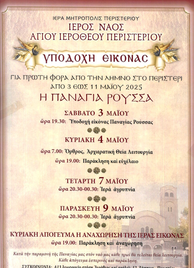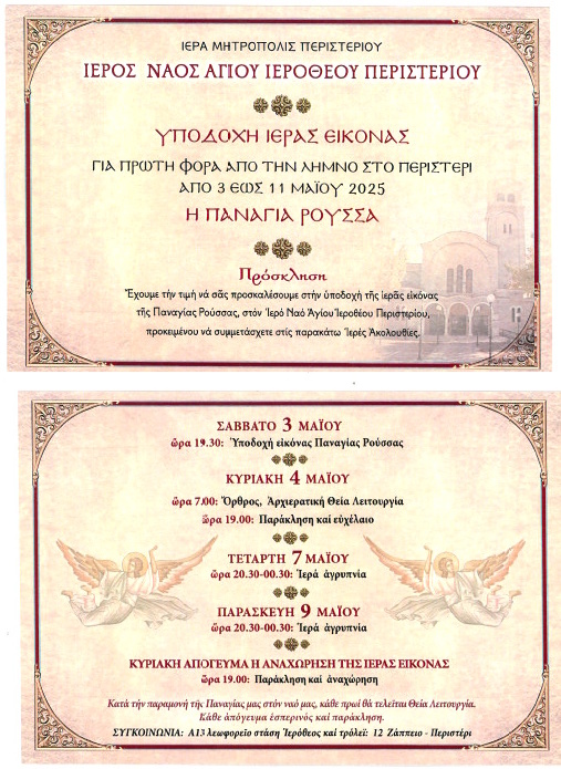 O Ιερός Ναός του Αγίου Ιεροθέου στο Περιστέρι υποδεχθεί το Σάββατο 3 Μαΐου το απόγευμα την εικόνα της Παναγίας της Ρούσσας από τη Λήμνο η οποία βρίσκεται στον Ιερό Ναό Κοιμήσεως της Θεοτόκου στο Τσας.