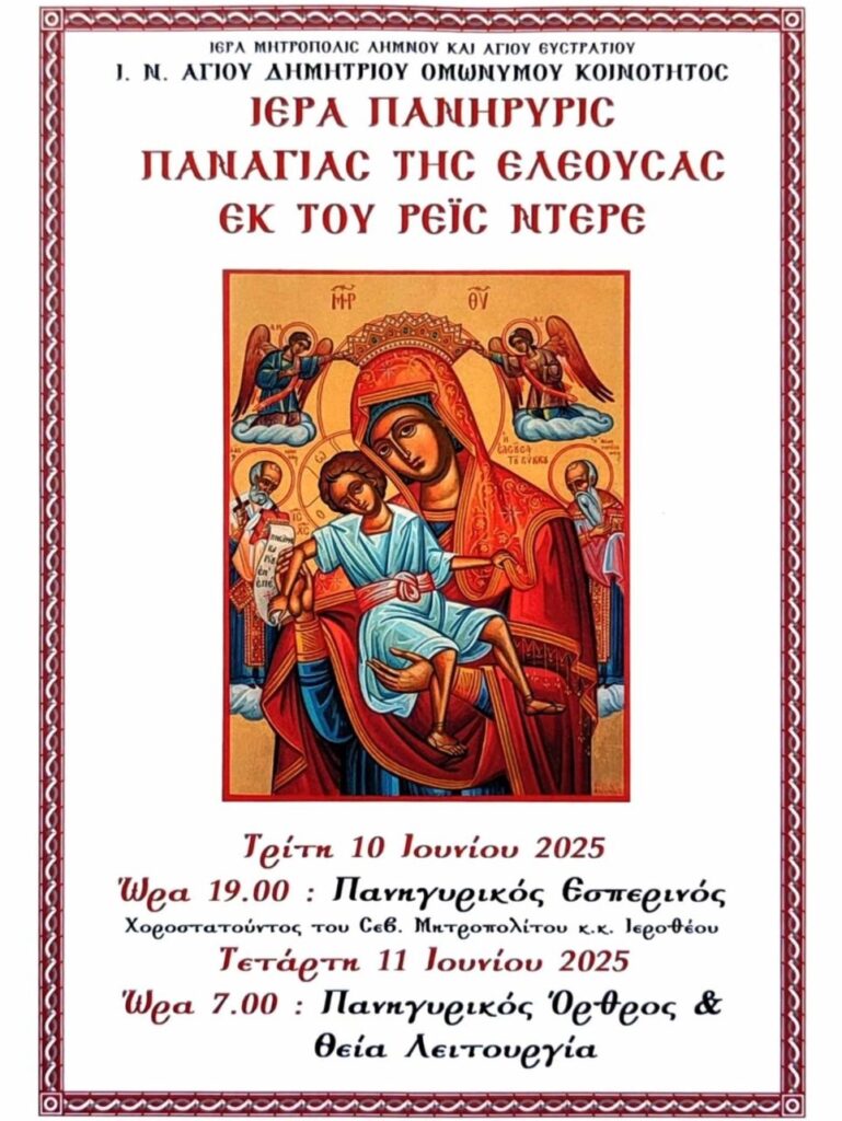 Πανηγυρικός Εσπερινός θα τελεστεί στον Άγιο Δημήτριο, προς τιμήν της Παναγίας Ελεούσας της εικόνας που είναι συνδεδεμένη με μνήμες απο το Ρεϊς Ντερέ. Στις ιερές ακολουθίες θα χοροστατήσει ο Σεβασμιότατος Ιερόθεος .