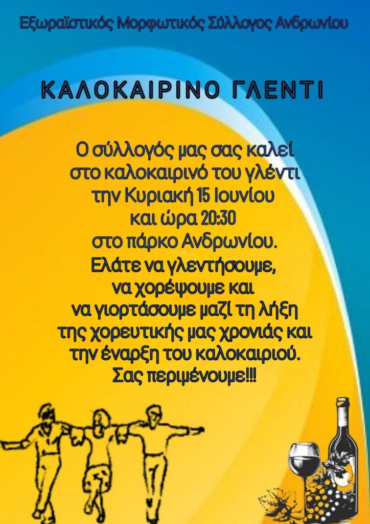 O Εξωραιστικός Μορφωτικός σύλλογος Ανδρωνίου διοργανώνει σήμερα 15 Ιουνίου στο πάρκο Ανδρωνίου ένα καλοκαιρινό γλέντι με πολύ χορό, γιορτάζοντας το τέλος της διδακτικής χορευτικής χρονιάς όπως αναφέρει στην ανακοινωσή του.