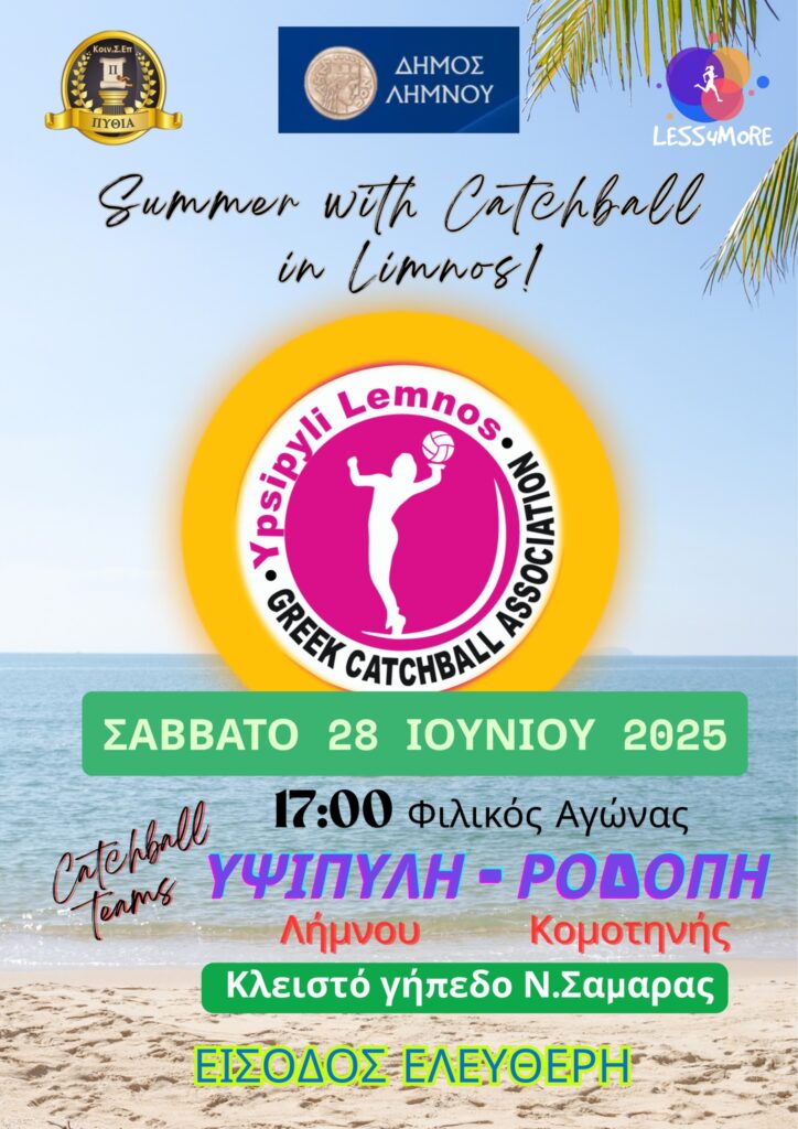 Σήμερα Σάββατο 28 Ιουνίου η ττοπική ομάδα catchball “Υψιπύλη Λήμνου” σε φιλικό αγώνα catchball στο Κλειστό Ν. Σαμαράς φιλοξενεί την “Ροδόπη Κομοτηνής” την οποία και θα αντιμετωπίσει σήμερα στις στις 17:00.