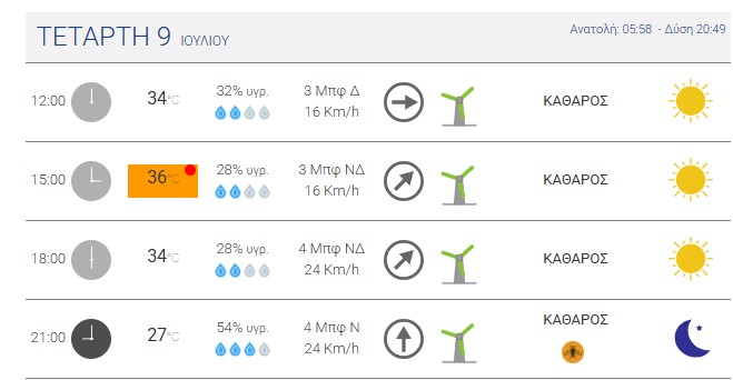 Θερμοκρασία: Από 25 έως 39 βαθμούς Κελσίου, στα παράκτια η μέγιστη 2 με 3 βαθμούς χαμηλότερη.