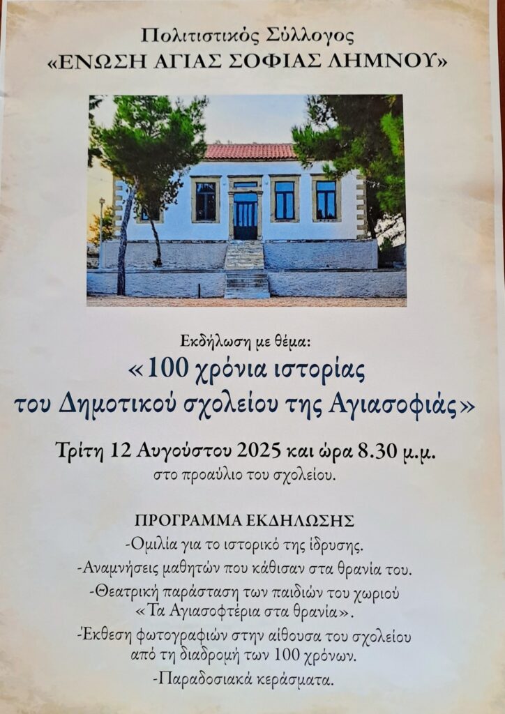 O Πολιτιστικός Σύλλογος ΕΝΩΣΗ ΑΓΙΑΣ ΣΟΦΙΑΣ ΛΗΜΝΟΥ την Τρίτη 12 Αυγούστου το απόγευμα θα παραγματοποιήσει εκδήλωση “100 χρόνια ιστορίας του δημοτικού σχολείου της Αγίας Σοφιάς” στον χώρο του σχολείου.