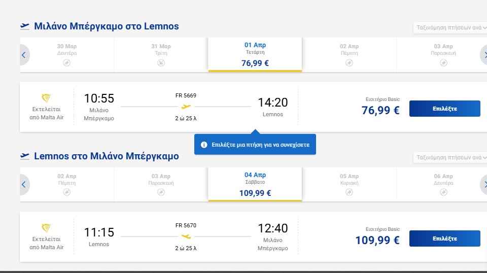 Σύμφωνα με το πρόγραμμα, οι πτήσεις από το Μπέργκαμο θα πραγματοποιούνται μεσημεριανές ώρες, διευκολύνοντας τους επιβάτες που θέλουν να ταξιδέψουν άμεσα στη Λήμνο ή να συνδεθούν με άλλους προορισμούς μέσω Ιταλίας. Οι πρώτες διαθέσιμες τιμές ξεκινούν από 76,99 ευρώ για το εισιτήριο απλής μετάβασης, ενώ η επιστροφή κοστολογείται από 109,99 ευρώ.