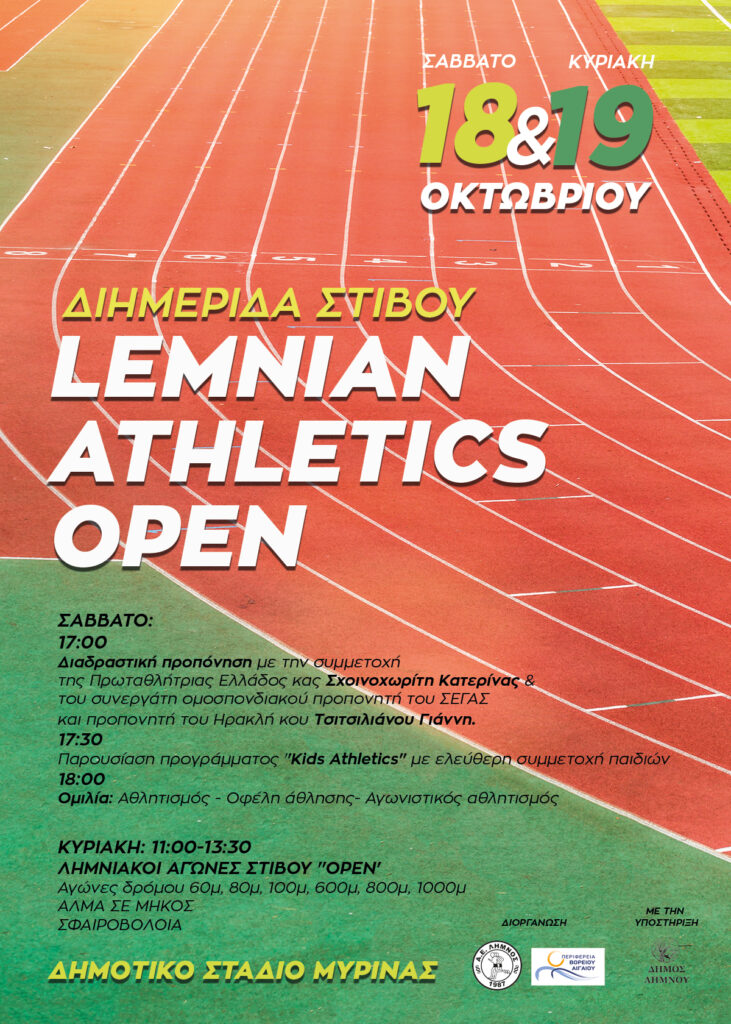 Το τμήμα Στίβου της Αθλητικής Ένωσης Λήμνου (Α.Ε.Λ.), σε συνδιοργάνωση με την Περιφέρεια Βορείου Αιγαίου – στο πλαίσιο του επίσημου Σχεδίου Αθλητικών Δράσεων της για το 2025 – και με την υποστήριξη του Δήμου Λήμνου, παρουσιάζει ένα διήμερο αφιερωμένο στον αθλητισμό, τη χαρά της συμμετοχής και την αξία της άσκησης για όλες τις ηλικίες.