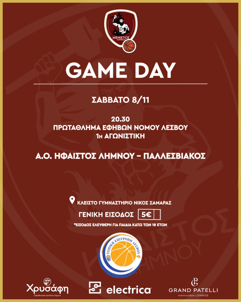 Ο Α.Ο. Ήφαιστος Λήμνου υποδέχεται τον Παλλεσβιακό στο Κλειστό Γυμναστήριο «Νίκος Σαμαράς», με το τζάμπολ να είναι προγραμματισμένο για τις 20:30.