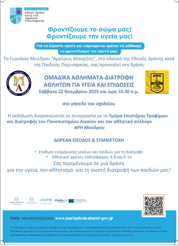 Με κεντρικό σύνθημα «Φροντίζουμε το σώμα μας – Φροντίζουμε την υγεία μας!», το Γυμνάσιο Μούδρου «Αργύριος Μοσχίδης» διοργανώνει το Σάββατο 22 Νοεμβρίου 2025 μια ξεχωριστή δράση αφιερωμένη στην υγεία, τον αθλητισμό και τη σωστή διατροφή των παιδιών. Η εκδήλωση εντάσσεται στο πλαίσιο της Εθνικής Δράσης κατά της Παιδικής Παχυσαρκίας, αναδεικνύοντας τη σημασία της πρόληψης και της αγωγής υγείας από νεαρή ηλικία.