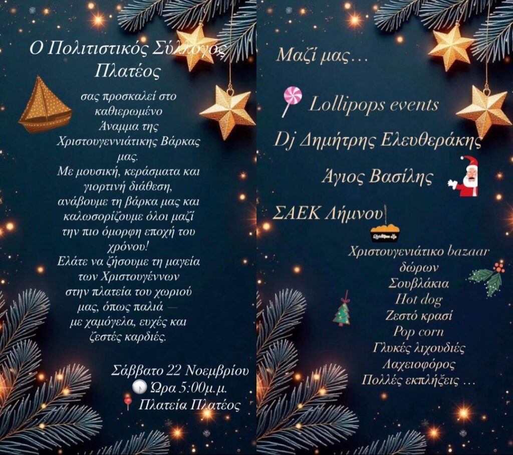 Οι εκδηλώσεις θα κάνουν επίσημη έναρξη το προσεχές Σάββατο 22 Νοεμβρίου, από την πλατεία του Πλατέος με τον τοπικό πολιτιστικό σύλλογο να μεταμορφώνει το χωριό σε ένα γιορτινό σκηνικό με μουσικές, φώτα και χρώματα. Το άναμμα του χριστουγεννιάτικου δέντρου θα αποτελέσει την πρώτη επίσημη στιγμή του εορταστικού προγράμματος, σηματοδοτώντας την αρχή ενός πλούσιου κύκλου εκδηλώσεων.