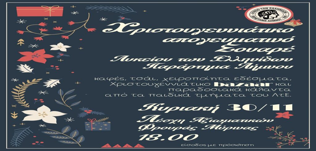 Χριστούγεννα σιμώνουν και το t διοργανώνει ένα ξεχωριστό σουαρέ για να μπούμε όλοι σιγά-σιγά στο πνεύμα των Χριστουγέννων! Bazaar με χειροποίητα στολίδια, κοσμήματα και λιχουδιές, γιορτινή ατμόσφαιρα με χριστουγεννιάτικα κάλαντα από τα παιδάκια μας, ροφήματα και σπιτικά εδέσματα…όλα αυτά, και ακόμη περισσότερα, την Κυριακή 30 Νοεμβρίου στις 6μμ, στη Λέσχη Αξιωματικών Φρουράς Μύρινας. Σας περιμένουμε με χαρά!