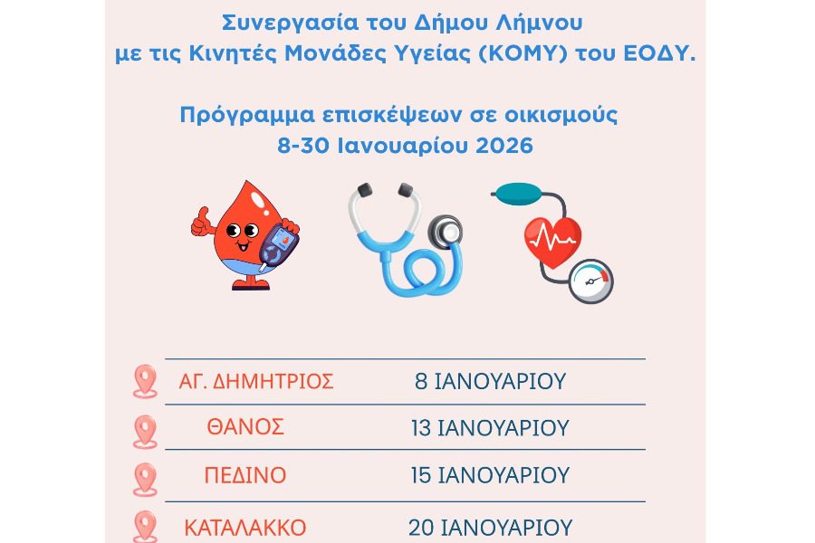 Σε συνεργασία με τον Δήμο Λήμνου, οι Κινητές Μονάδες Υγείας ΚΟΜΥ του ΕΟΔΥ θα πραγματοποιήσουν προληπτικούς ελέγχους σε οικισμούς του νησιού στο διάστημα από 8 έως 30 Ιανουαρίου 2026.