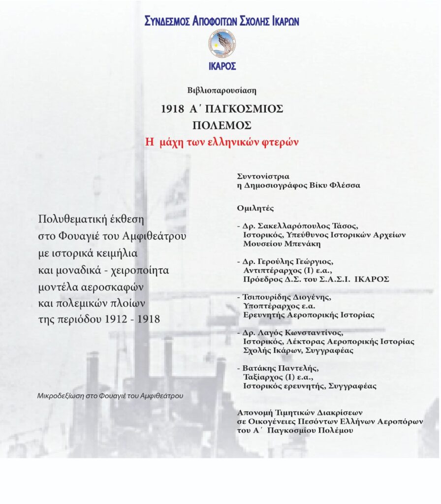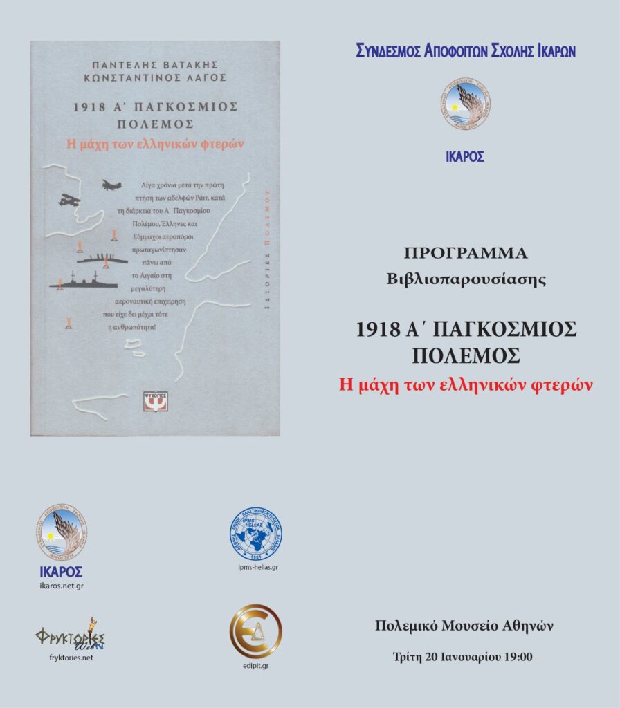 Την Τρίτη 20 Ιανουαρίου, στις 19:00, στο Πολεμικό Μουσείο Αθηνών, θα πραγματοποιηθεί η βιβλιοπαρουσίαση του έργου «1918 – Α΄ Παγκόσμιος Πόλεμος: Η μάχη των ελληνικών φτερών», στο πλαίσιο μιας πολυδιάστατης εκδήλωσης ιστορικού και επετειακού χαρακτήρα, που συνδιοργανώνει ο Σύνδεσμος Αποφοίτων Σχολής Ικάρων «Ίκαρος».