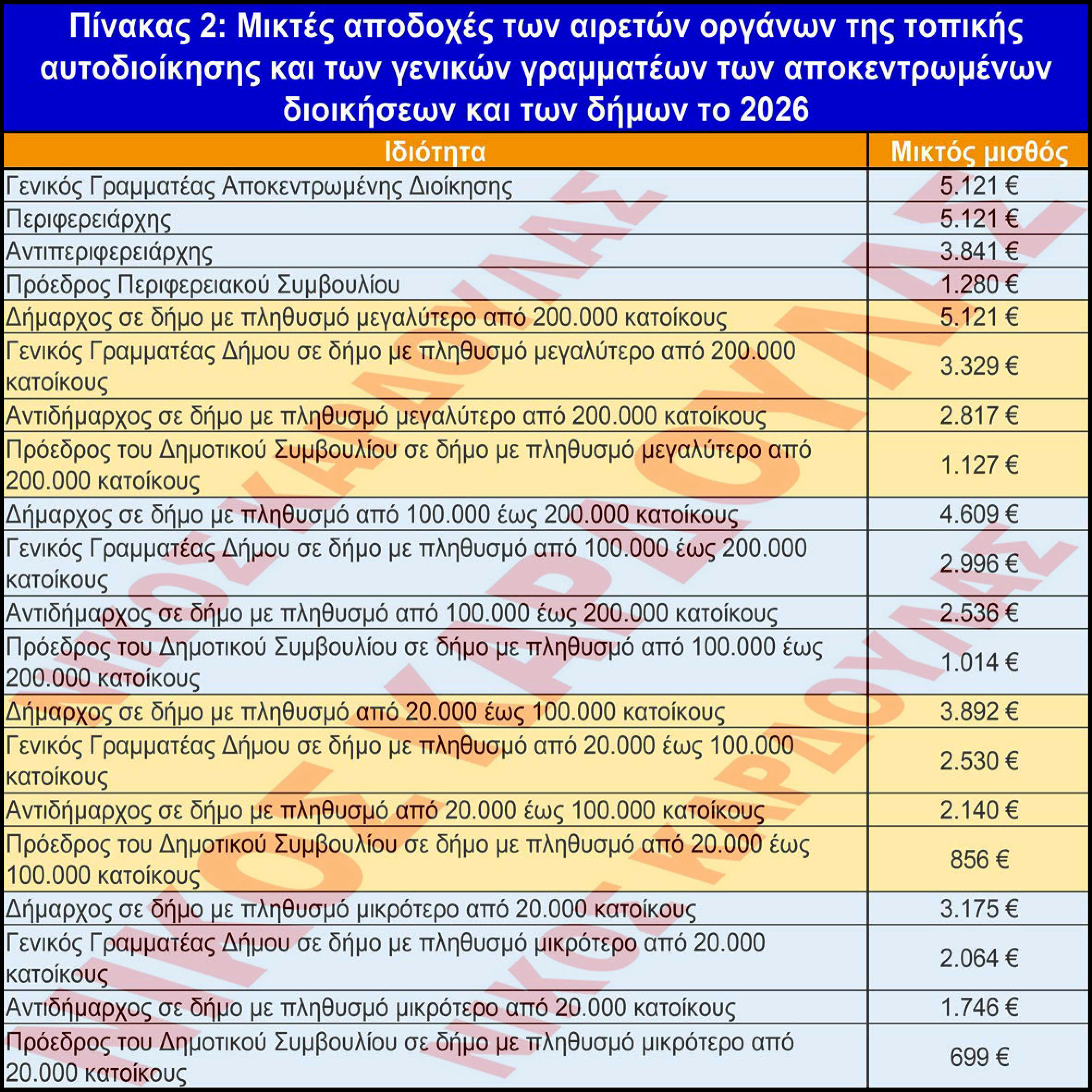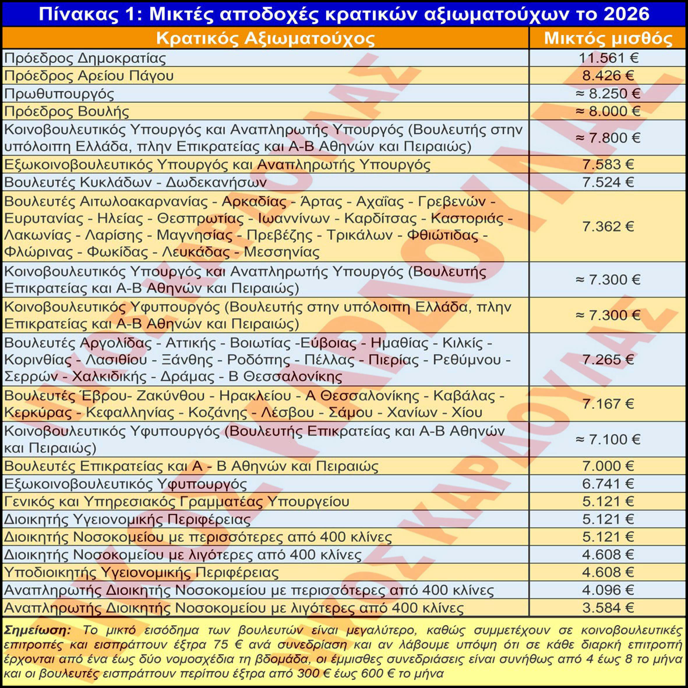 Λαμβάνοντας υπόψη επίσημα στοιχεία από τη Βουλή, από ΦΕΚ και από δημοσιεύσεις στο διαδίκτυο, συντάχθηκαν οι δύο παρακάτω πίνακες, όπου απεικονίζονται στον πίνακα 1 οι μικτές αποδοχές των κρατικών αξιωματούχων και στον πίνακα 2 οι μικτές αποδοχές των αιρετών οργάνων της Τοπικής Αυτοδιοίκησης και των Γενικών Γραμματέων των Αποκεντρωμένων Διοικήσεων και των Δήμων, για το έτος 2026.