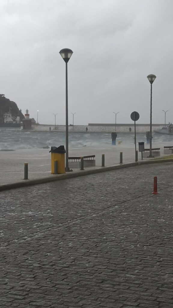 Τα κύματα υψώνονταν απειλητικά μέσα στο λιμάνι, ενώ ο άνεμος λύγιζε τα δέντρα και έκανε δύσκολη ακόμη και τη μετακίνηση. Το οδόστρωμα γυάλισε από το νερό, και η ατμόσφαιρα γέμισε θαλασσινό ψιλόβροχο, μειώνοντας την ορατότητα και ενισχύοντας το αίσθημα αγριάδας της στιγμής.