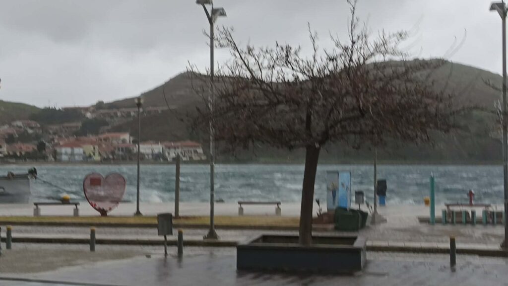 Το μπουρίνι έφτασε αιφνιδιαστικά στο λιμάνι της Μύρινας, σκοτεινιάζοντας τον ουρανό και μεταμορφώνοντας το γνώριμο τοπίο σε σκηνικό έντασης. Οι θυελλώδεις νοτιάδες σάρωσαν τον παραλιακό χώρο, με τη βροχή να πέφτει οριζόντια και τη θάλασσα να αφρίζει, χτυπώντας με δύναμη τον μόλο και τα δεμένα σκάφη.