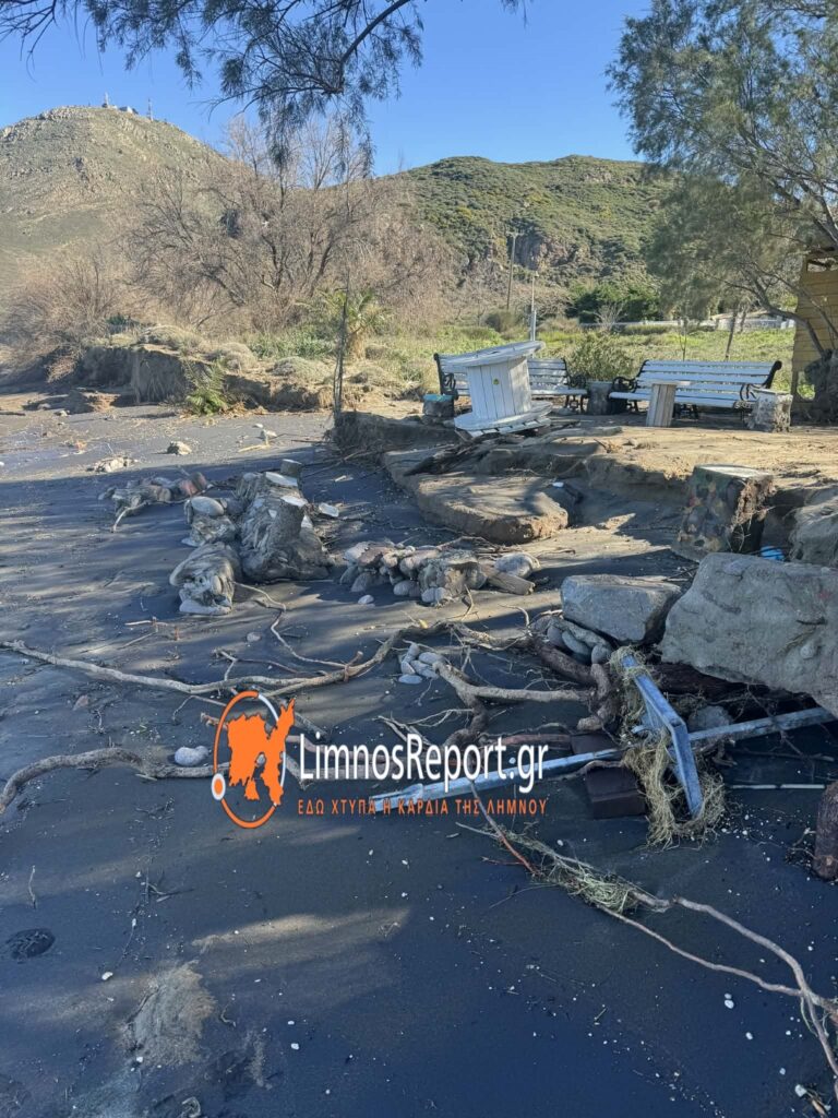 Σε αρκετά σημεία της παραλίας παρατηρείται έντονη υποχώρηση των αμμολόφων, με απότομα πρανή να σχηματίζονται εκεί όπου άλλοτε υπήρχε ομαλή πρόσβαση στη θάλασσα. Τα κύματα μετέφεραν πέτρες, κλαδιά και φερτά υλικά, ενώ δεν έλειψαν και οι φθορές σε παγκάκια και μικρές κατασκευές που βρίσκονταν κοντά στην ακτή.