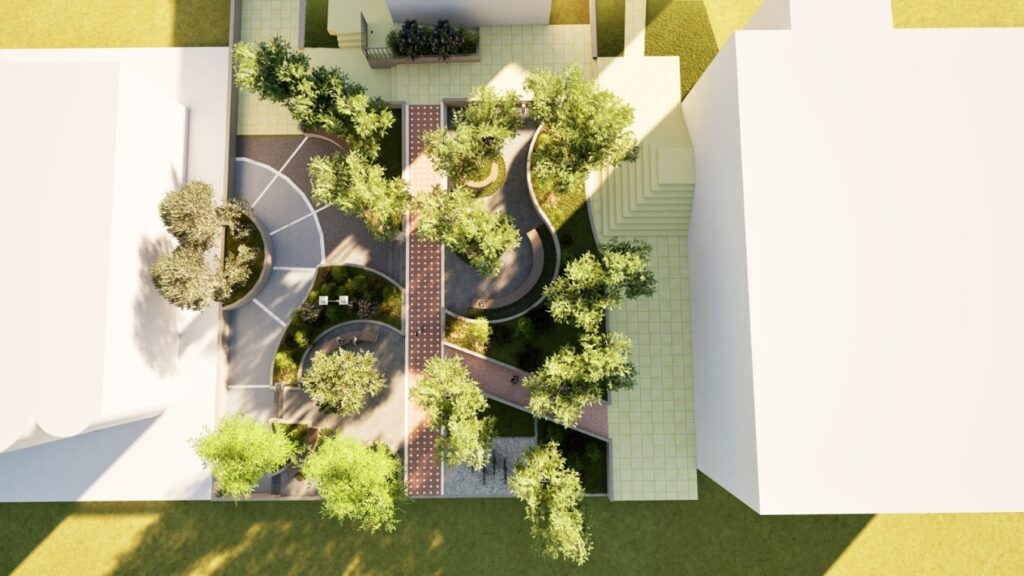 Ιδιαίτερη έμφαση δίνεται στην ενίσχυση του πρασίνου και τη βελτίωση της αισθητικής του χώρου, με αύξηση των φυτεύσεων, μεταφορά ενός δέντρου σε καταλληλότερη θέση και προσθήκη νέου για ενίσχυση της σκίασης. Παράλληλα, ο χώρος θα διαχωριστεί σε επιμέρους ζώνες στάσης και συγκέντρωσης, ώστε να εξυπηρετεί διαφορετικές ανάγκες των κατοίκων και επισκεπτών.