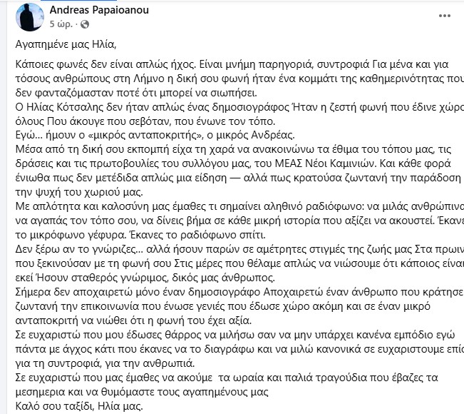 Αύριο, Τρίτη 24 Φεβρουαρίου 12:00 το μεσημέρι, στον Ιερό Ναό Αγίου Παντελεήμονα στο Ανδρώνι, η Λήμνος θα πει το τελευταίο αντίο σε έναν άνθρωπο που σημάδεψε βαθιά τη δημοσιογραφία και τη δημόσια ζωή του τόπου. Τα μέσα κοινωνικής δικτύωσης πλημμύρισαν από λέξεις γεμάτες συγκίνηση, αγάπη και ευγνωμοσύνη. Δεν ήταν απλώς μηνύματα αποχαιρετισμού· ήταν η συλλογική μνήμη ενός νησιού που αναγνωρίζει σε έναν άνθρωπο το δικό του αποτύπωμα.