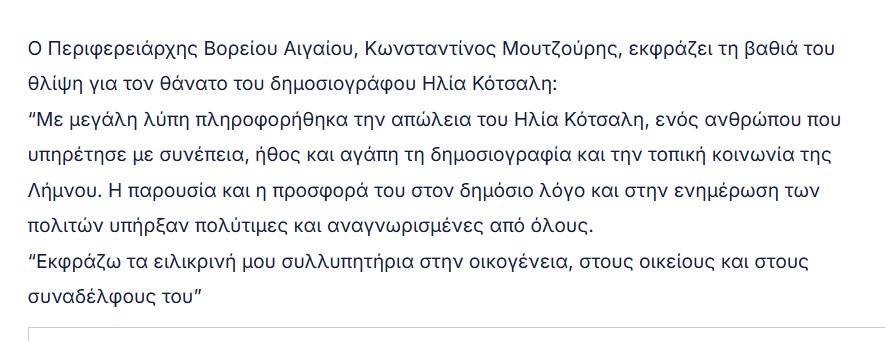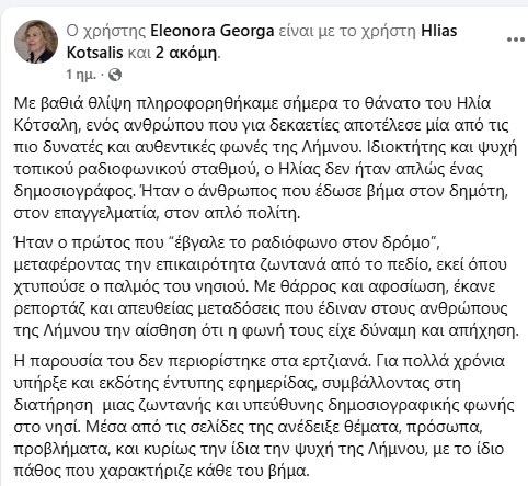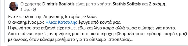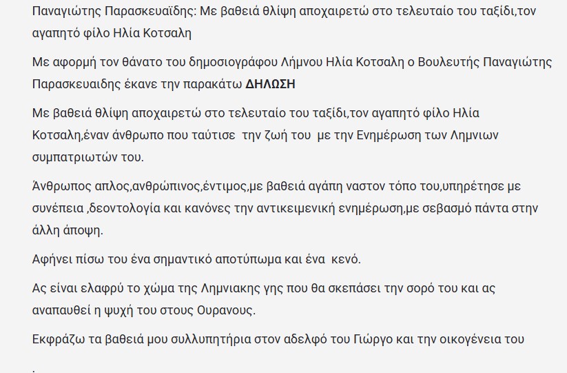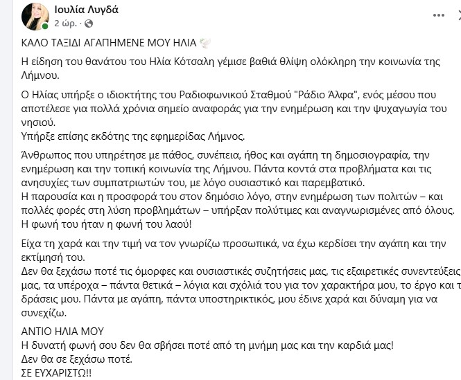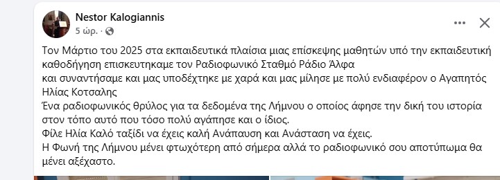 Η Λήμνος ξέρει να τιμά τους ανθρώπους της. Κι όσο οι σκέψεις για το πώς θα μείνει ζωντανή η μνήμη του αρχίζουν να συζητιούνται — ίσως μια οδός στο αγαπημένο του Ανδρώνι, ακόμα και η αγαπημένη του πλατεία, ίσως ένας χώρος που τόσο αγάπησε — το βέβαιο είναι ότι ο Ηλίας Κότσαλης έχει ήδη χαράξει τη θέση του στην ιστορία του νησιού. Όχι μόνο ως δημοσιογράφος, αλλά ως σύμβολο μιας εποχής που η φωνή μπορούσε να ενώσει, να διεκδικήσει και να αλλάξει τα πράγματα.