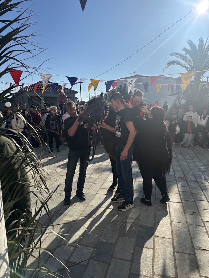 Πλήθος κόσμου κατέκλυσε τον προαύλιο χώρο της εκκλησίας, όπου τελέστηκε η πανηγυρική Θεία Λειτουργία και ακολούθησε η ευλογία των αλόγων και των αναβατών. Η παρουσία των αλόγων, στολισμένων και έτοιμων για τη μεγάλη στιγμή, αποτέλεσε όπως κάθε χρόνο το επίκεντρο του ενδιαφέροντος, μικρών και μεγάλων.