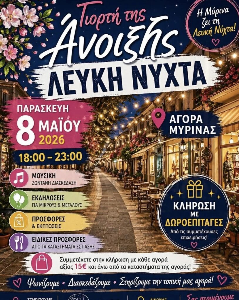 Η «Γιορτή της Άνοιξης – Λευκή Νύχτα» στη Μύρινα αποτελεί μία ξεχωριστή εκδήλωση που φέρνει ζωντάνια, χρώμα και αισιοδοξία στην τοπική κοινωνία, σηματοδοτώντας την έναρξη της ανοιξιάτικης περιόδου. Την Παρασκευή 8 Μαΐου 2026, από τις 18:00 έως τις 23:00, η αγορά της Μύρινας μετατρέπεται σε έναν ανοιχτό χώρο γιορτής, ψυχαγωγίας και εμπορικής δραστηριότητας.