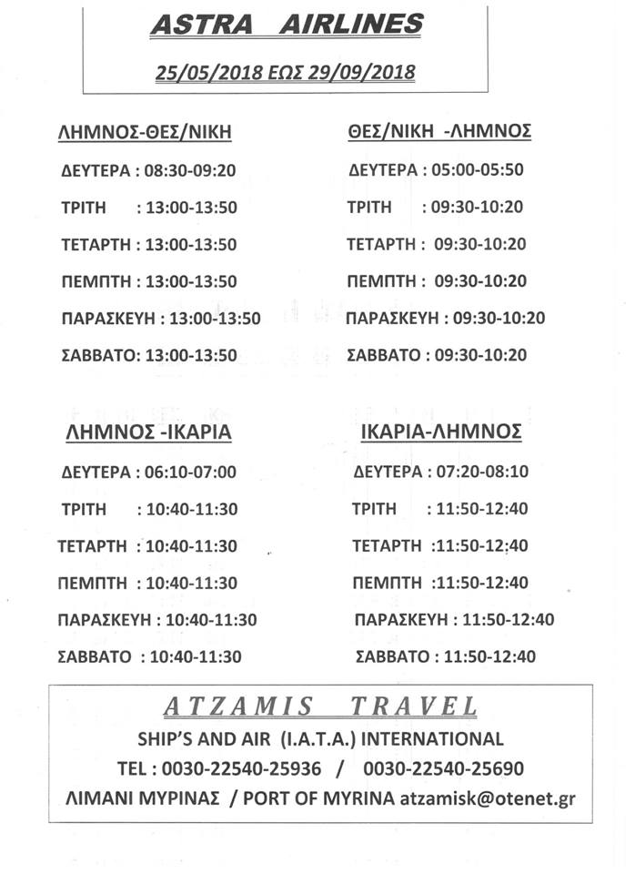 Το πρακτορείο Atzamis Travel στην Λήμνο, ενημερώνει τους ταξιδιώτες για τα αεροπορικά δρομολόγια από και προς Λήμνο, για Θεσσαλονίκη και Ικαρία έως τον Σεπτέμβριο 2018