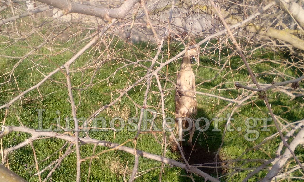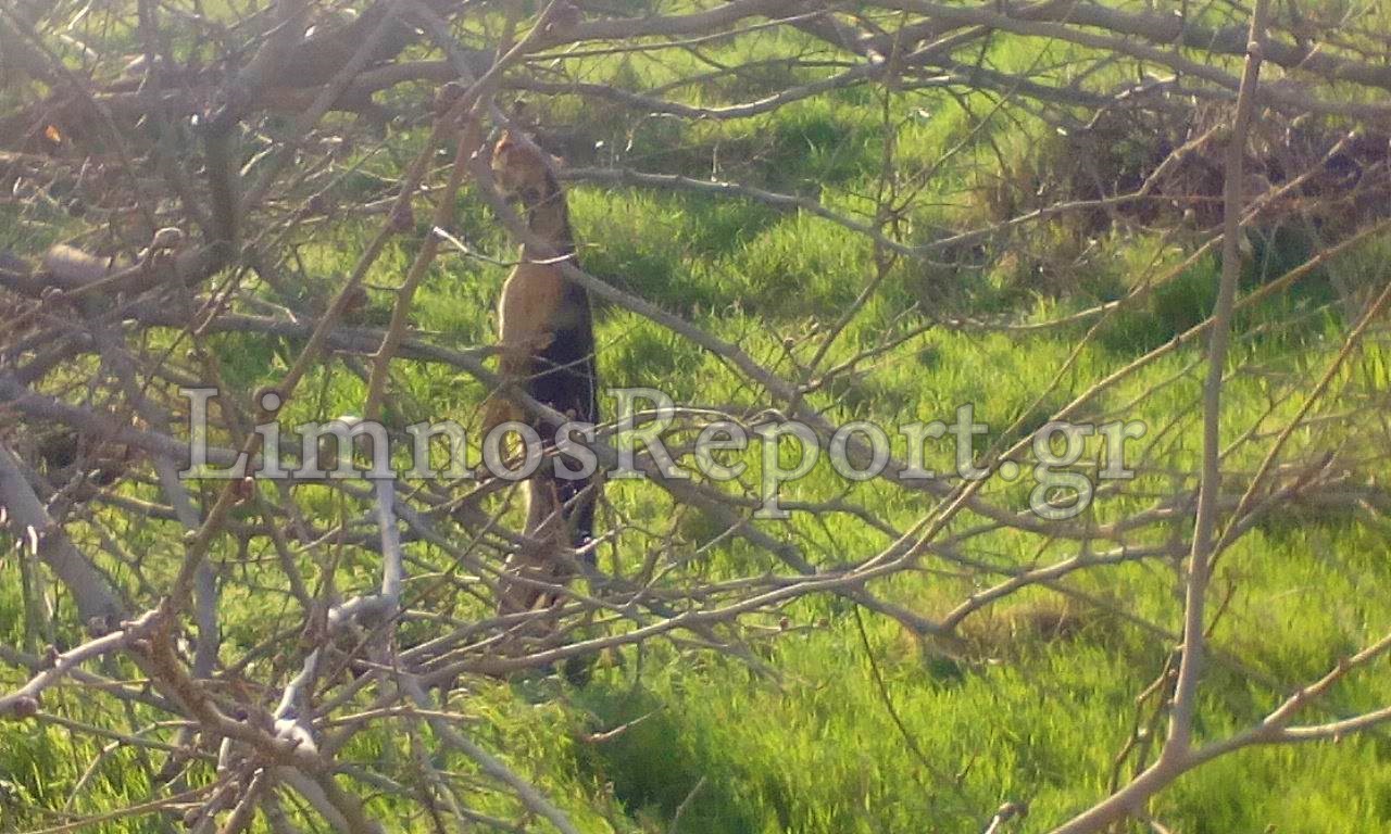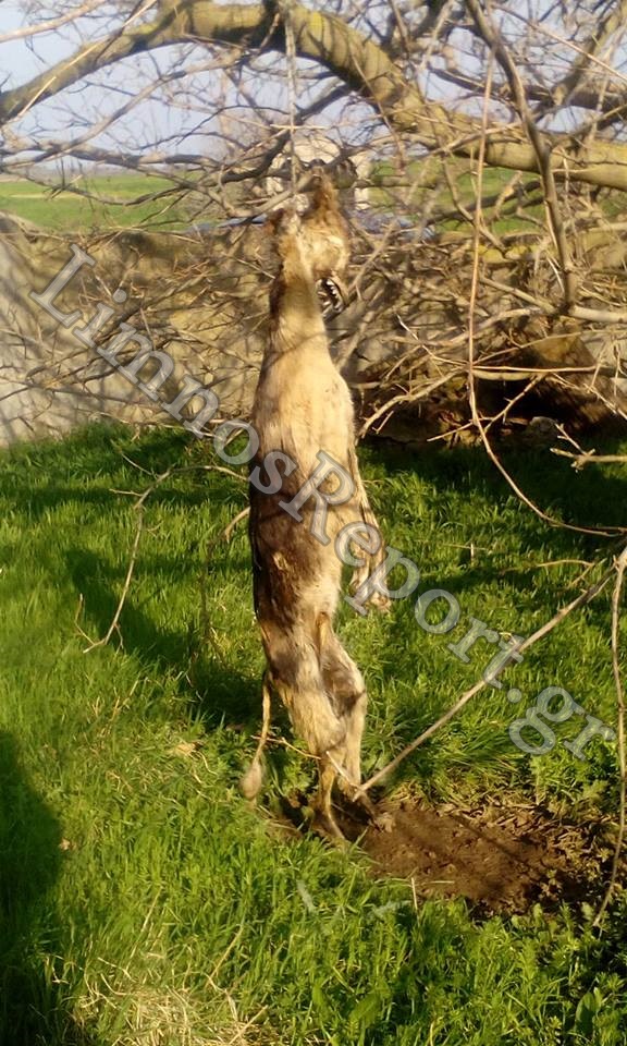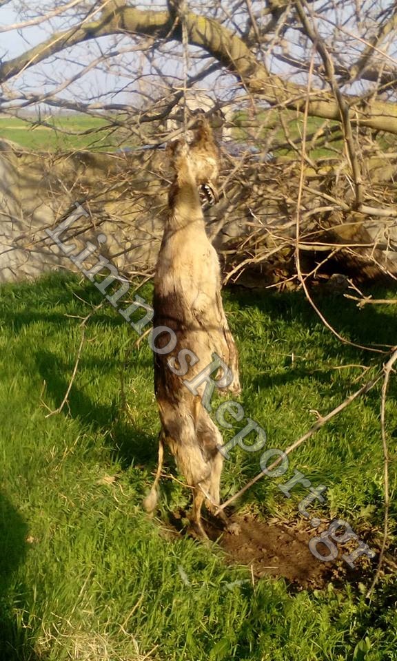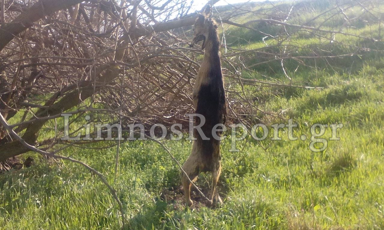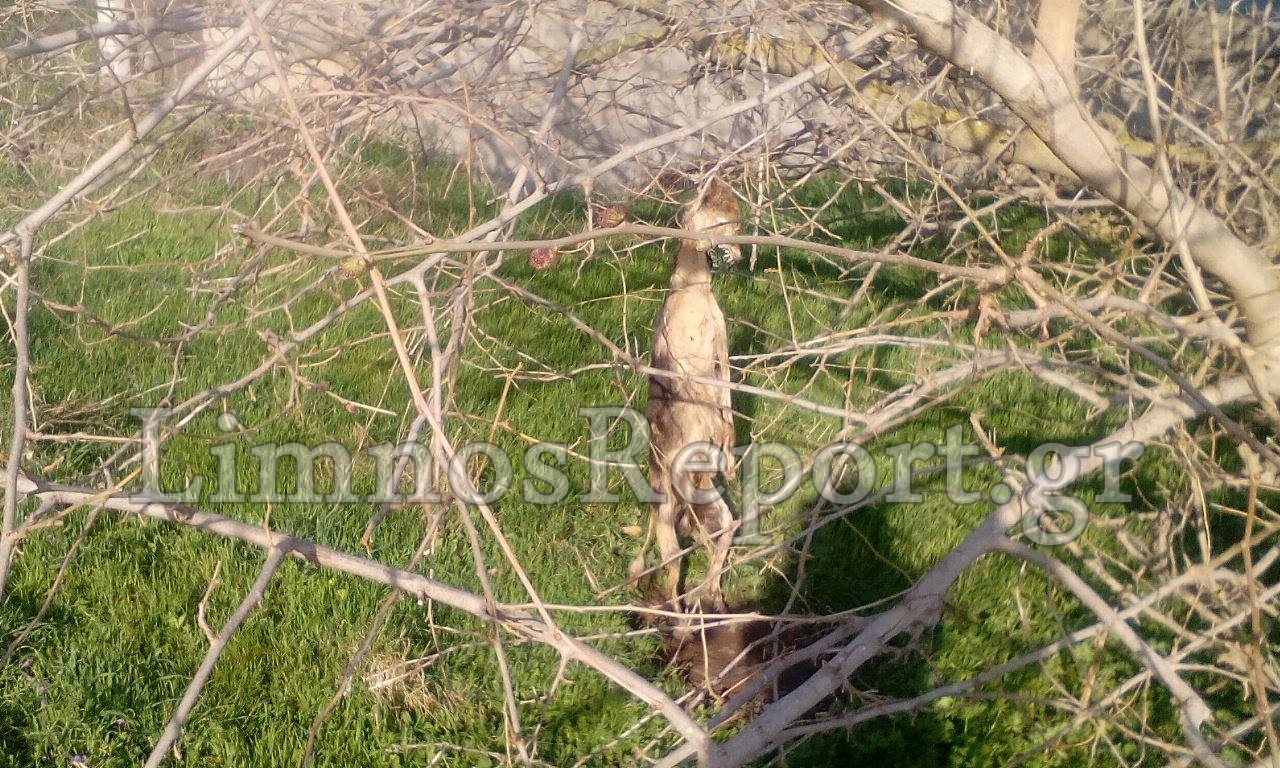 To σώμα του άτυχου τετράποδου βρέθηκε να κρέμεται σε δέντρο πίσω από κάποιες μάντρες στην επαρχιακή οδο μεταξη Ρεπανιδίου προς Ρωμανού στη Λήμνο