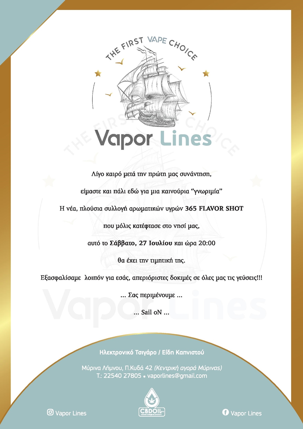 Η νέα πλούσια συλλογή αρωματικών υγρών 365 FLAVOR SHOT που μόλις κατέφτασε στο νησί μας, αυτό το Σάββατο 27 Ιουλίου και ώρα 20:00θα έχει την τιμητική της!