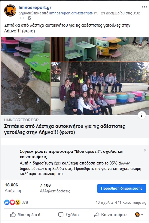 Μετά από 18.000 επισκέψεις το άρθρο του limnosreport για τα Σπιτάκια από λάστιχα αυτοκινήτου για τις αδέσποτες γατούλες στην Λήμνο όπως ήταν λογικό “έπαιξε” και στο χθεσινό κεντρικό δελτίο ειδήσεων του ΣΚΑΪ στα καλά νέα της ημέρας