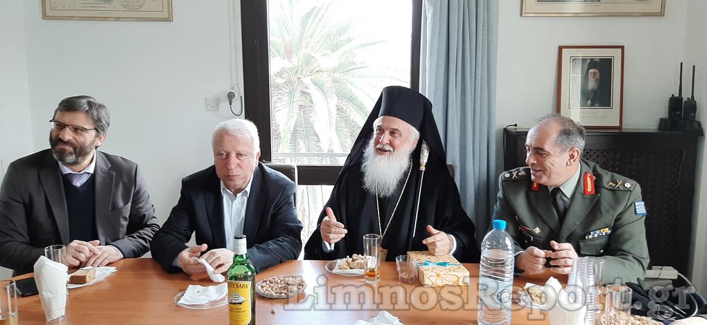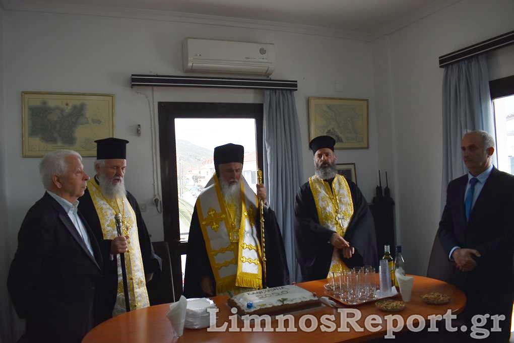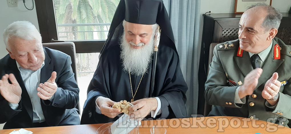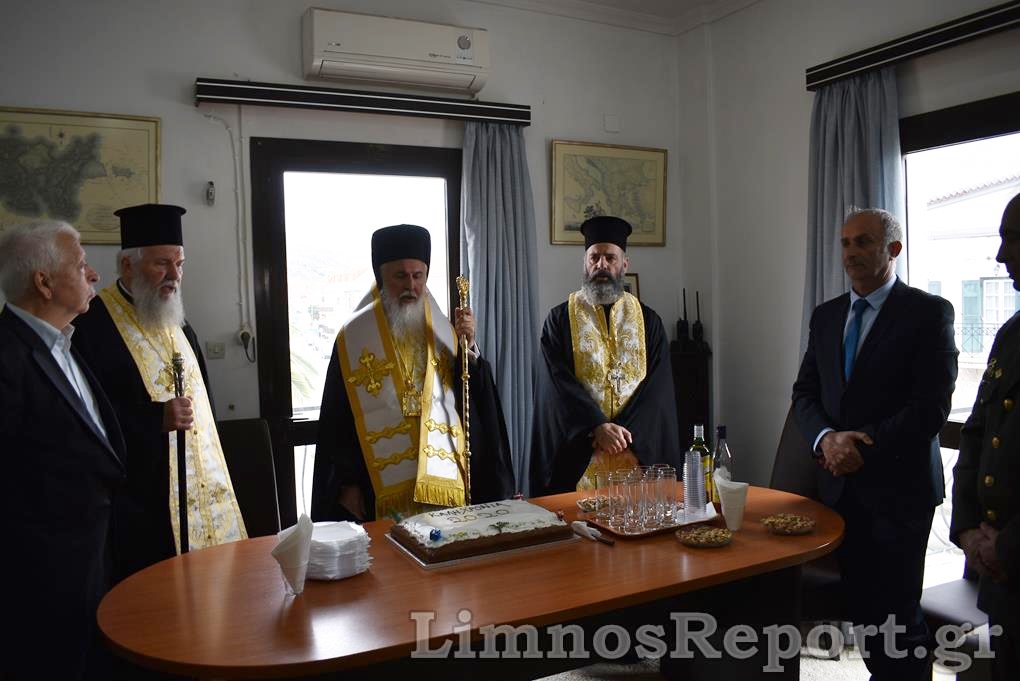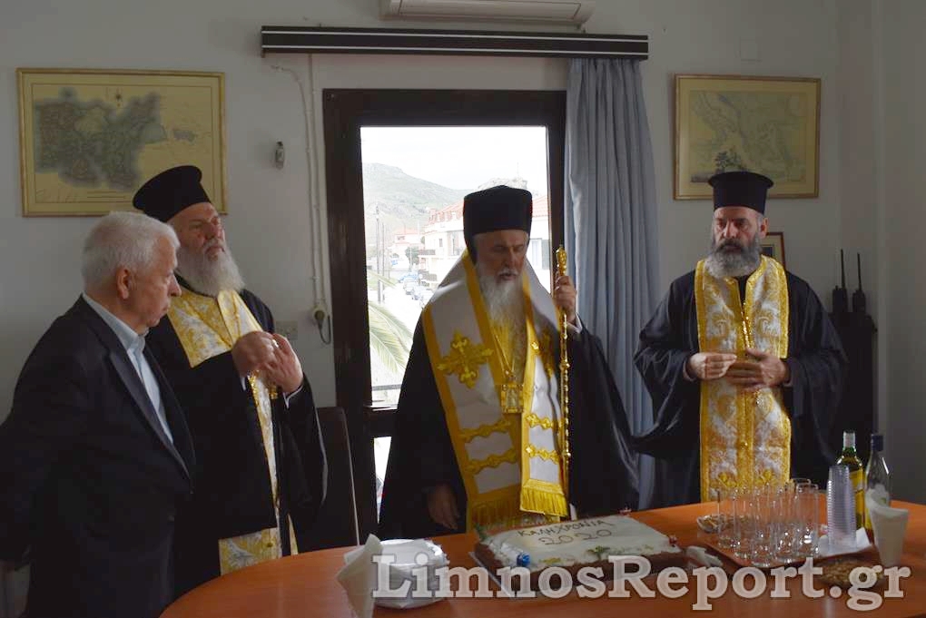 Στην τελετή για την κοπή της βασιλόπιτας χοροστάτησε Σεβασμιωτάτος Μητροπολίτης Λήμνου και Αγίου Ευστρατίου κ.κ. Ιεροθέος, συνοδευόμενος από τον Αρχιμανδρίτη και Πρωτοσύγκελο πα. Γεράσιμο Πετρολέκα και τον Αρχιμανδρίτη πα. Κύριλλο Αλεξανδρόπουλο