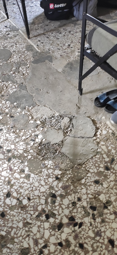 Στο πάτωμα του θαλάμου υπήρχε η παρακάτω ζημία, σπασμένες πέτρες ενώ στο θάλαμο γινόταν καθημερινή αναφορά. Ο επόπτης κατά την πρωινή αναφορά κοιτούσε κατά πόσο βεβαίως έχεις βάλει σωστά τις παντόφλες σου και το μαξιλάρι σου σε σχήμα φακέλου αλλά παράβλεπε την ζημία αυτή οπού εύκολα μπορούσε κάποιος να χτυπήσει ή να σπάσει δάχτυλο. Και μιλάμε προφανώς για διαφορετικό Αξιωματικό Υπηρεσίας κάθε μέρα, άρα προφανώς δεν ήταν προσωπικό το θέμα. Το κλίμα αδιαφορίας γύρω από τέτοια ζητήματα ήταν γενικό και τύχαινε να λύνονται μόνο εάν έρθει ανώτερος εξωτερικός παράγοντας στο στρατόπεδο και μπει στον θάλαμο.
