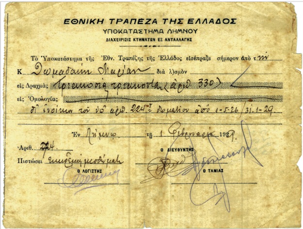 - Απόδειξη πληρωμής του Υποκαταστήματος της ΕΤΕ Λήμνου της 1ης Φεβρουαρίου 1929, από το οποίο προκύπτει η εξόφληση από την γιαγιά μου Μαρία (Μαργίτσα) Θωμαδάκη -Σκαφίδα, του ενοικίου του δωματίου στο οποίο διέμεναν τα διασωθέντα από την σφαγή του 1922 στο Ρεΐζντερε Ερυθραίας Μικράς Ασίας, μέλη της οικογένειας του παππού Δημητρίου Θωμαδάκη, από 1-5-1926 μέχρι 31-1-1929. Στο εν λόγω δωμάτιο διέμειναν από το έτος 1924, όταν ολοκληρώθηκε η μεταφορά του τουρκικού πληθυσμού της Λήμνου στην Τουρκία…