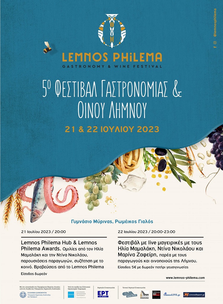 “Εξάλλου, στις 21 και 22 Ιουλίου διεξάγεται στη Μύρινα το 5ο Φεστιβάλ Γαστρονομίας & Οίνου Λήμνου «Lemnos Philema 2023» από τον Σύλλογο Γαστρονομίας και Οίνου Λήμνου. Στο πλαίσιο του φεστιβάλ θα πραγματοποιηθούν η ημερίδα Lemnos Philema Hub με θέμα «Εντοπιότητα και τα ελληνικά προϊόντα στο εξωτερικό» και καλεσμένους ομιλητές τους chef Ηλία Μαμαλάκη και Ντίνα Νικολάου, τα Lemnos Philema Awards για την επιβράβευση της συνεισφοράς στον πολιτισμό, τη γαστρονομία και τον οίνο της Λήμνου, και live cooking session από τους Ηλ. Μαμαλάκη, Ντ. Νικολάου και Μαρίνα Ζαφείρη, με τη συμμετοχή οινοπαραγωγών του νησιού που θα παρουσιάσουν τα προϊόντα τους. Πρόκειται για μια καινοτόμα δράση γαστρονομικού τουρισμού, η οποία προωθεί τον μεσογειακό τρόπο ζωής με μοχλό την ελληνική γαστρονομία και συμβάλλει δυναμικά στην προβολή της Λήμνου.”