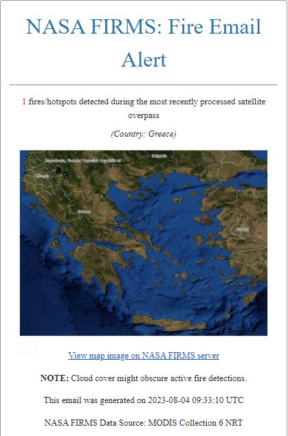 O Θωμάς  Παπαλάσκαρης Καβαλιώτης «Πολιτικός Μηχανικός» εντόπισε με την βοήθεια της χρήσης δορυφορικών δεδομένων και γεωγραφικών πληροφοριακών συστημάτων, φωτιά/θερμό σημείο, σε «κοντινό πραγματικό χρόνο» («near real time»), στην νήσο «Άγιο Ευστράτιο», του «Δήμου Αγίου Ευστρατίου («Λήμνου»)», του «Νομού Λέσβου», της «Περιφέρειας Βορείου Αιγαίου», με άφιξη ειδοποίησης στο προσωπικό του «e-mail», στις «12:33:10» («Ώρα Ελλάδας»), (μετά το μεσημέρι), («Παρασκευή 04 Αυγούστου 2023»), στην συγκεκριμένη θέση με τις γεωγραφικές συντεταγμένες «Γεωγραφικό Πλάτος: 39.476170° / Γεωγραφικό Μήκος: 24.993020°», από το σύστημα «MODIS-C6 Fire», έπειτα από εγγραφή στην διαδικτυακή πλατφόρμα «Fire Information for Resource Management System», (εν συντομία «FIRMS») του συστήματος «Nasa/Earthdata».