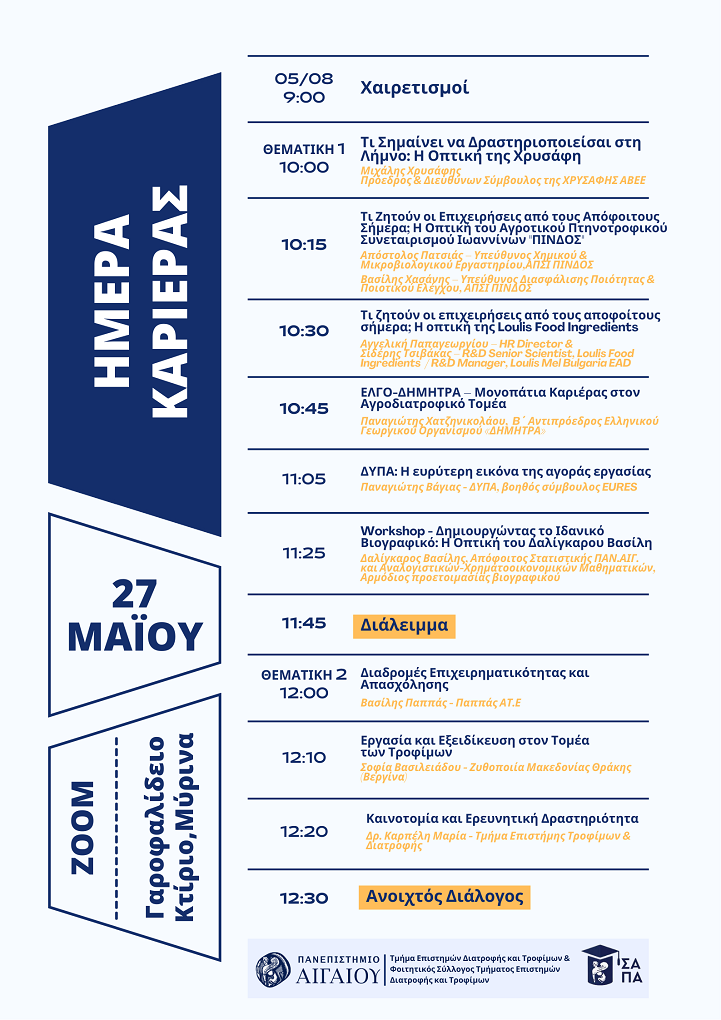 Ο Σύλλογος Αποφοίτων του Πανεπιστημίου Αιγαίου, σε συνεργασία με το Τμήμα Επιστήμης Τροφίμων και Διατροφής και τον Φοιτητικό Σύλλογο, σας προσκαλεί στην Ημέρα Καριέρας, μια εκδήλωση που απευθύνεται σε φοιτητές, αποφοίτους και επαγγελματίες του κλάδου των τροφίμων, αλλά και σε όποιον ενδιαφέρεται να μάθει περισσότερα για τον συγκεκριμένο τομέα.