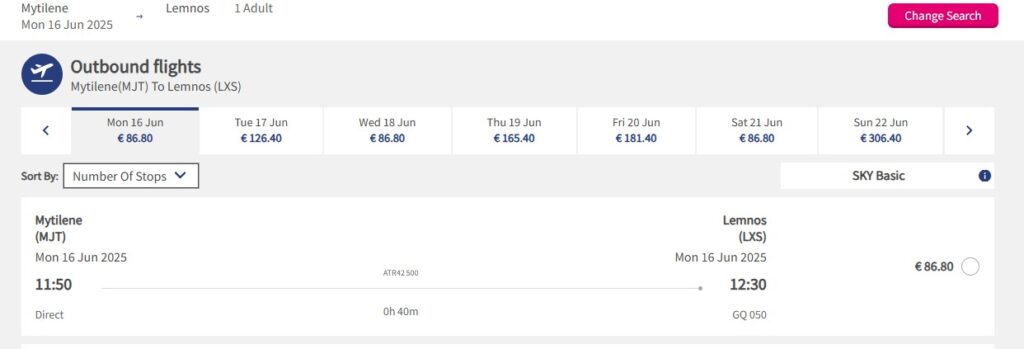 Σε μία αναζήτηση για την επόμενη εβδομάδα Δευτέρα 16 Ιουνίου αλλά και την Τετάρτη και Σάββατο  η τιμή του εισιτηρίου απο Μυτιλήνη για Λήμνο είναι στα 86.80!!