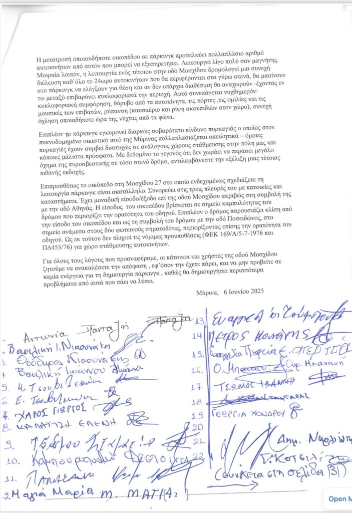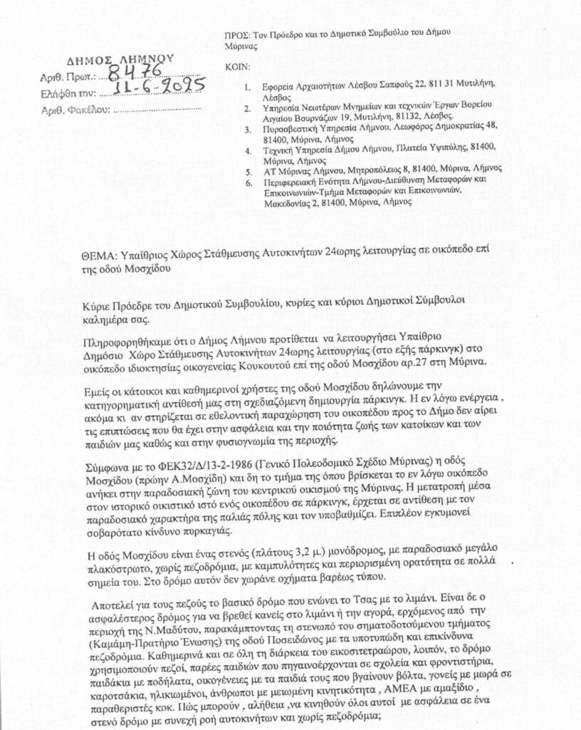Ζητούν μάλιστα την ακύρωση της πρόσφατης απόφασης του Δ. Συμβουλίου επικαλούμενοι λόγους που έχουν να κάνουν με την επιδείνωση του κυκλοφοριακού προβλήματος στην περιοχή, ενώ ιδιαίτερη αναφορά γίνεται στην παραδοσιακή ζώνη του οικισμού της Μύρινας στη οποία ανήκει το οικόπεδο.