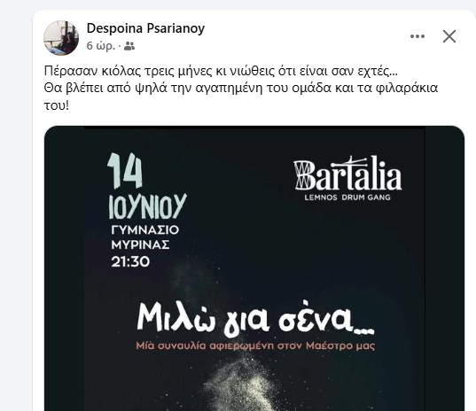 Μια συγκινητική στιγμή θα ζήσουν όσοι βρεθούν το Σάββατο 14 Ιουνίου στο Γυμνάσιο της Μύρινας. Τo συγκρότημα, η μουσική ομάδα, τα Bartalia Lemnos Drum Gang θα δώσουν μια μοναδική συναυλία αφιερωμένη στο Μαέστρο Νίκο Αμπατζή που έφυγε νωρίς…..
