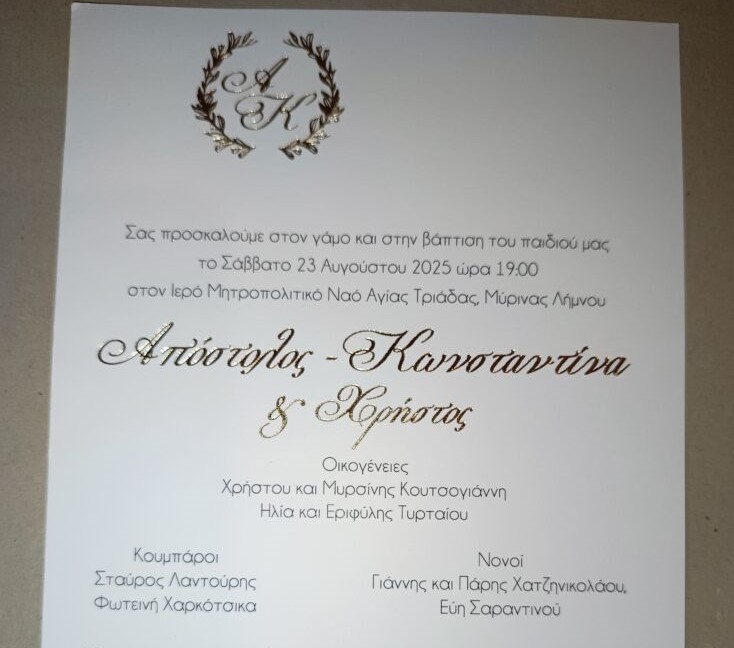 Η παρουσία υψηλών προσκεκλημένων, όπως του Περιφερειάρχη Βορείου Αιγαίου Κώστα Μουτζούρη, των βουλευτών του Νομού Λέσβου Αθανασίου και Παρασκευαϊδη, του Γ.Γ. Αιγαίου Κουτουλάκη, Αντιπεριφερειαρχών τοπικών αιρετών, θεσμικών εκπροσώπων και φίλων της οικογένειας θα λαμπρύνουν με την παρουσία τους το χαρμόσυνο γεγονός.