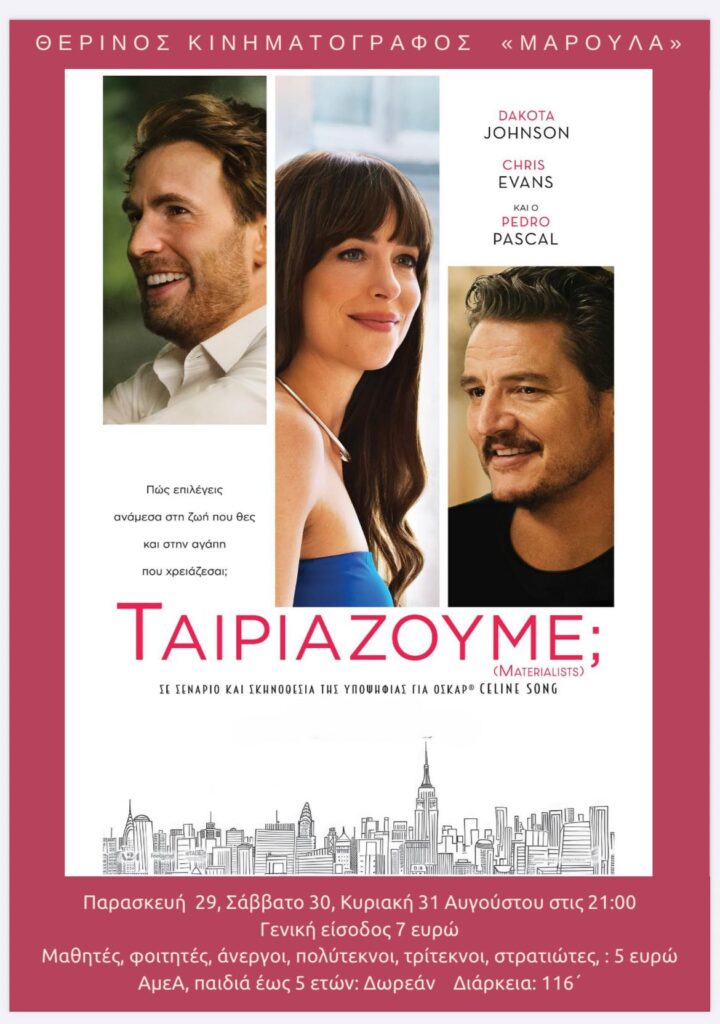 Οι προβολές του θερινού κινηματογράφου “Μαρούλα” ολοκληρώνονται για φέτος με την ταινία “Ταιριάζουμε;”, με πρωταγωνίστρια τη Ντακότα Τζόνσον (50 αποχρώσεις του γκρι), η οποία μας θέτει το ερώτημα “Πώς επιλέγεις ανάμεσα στη ζωή που θες και στην αγάπη που χρειάζεσαι;”.