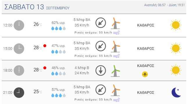 Σύμφωνα με την πρόγνωση του καιρού, οι άνεμοι θα πνέουν από βόρειες διευθύνσεις 3 με 4 και στο Αιγαίο5 με 6 και τοπικά από το μεσημέρι 7 μποφόρ.