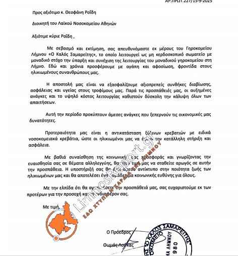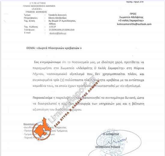 Τρία πολύσπαστα ηλεκτροκίνητα κρεβάτια θα βρίσκονται τις επόμενες ημέρες στο Γηροκομείο Λήμνου μετά από Δωρεά του διοικητή του Γ.Ν.Α. «Λαϊκό» Θεοφάνη Ροΐδη.